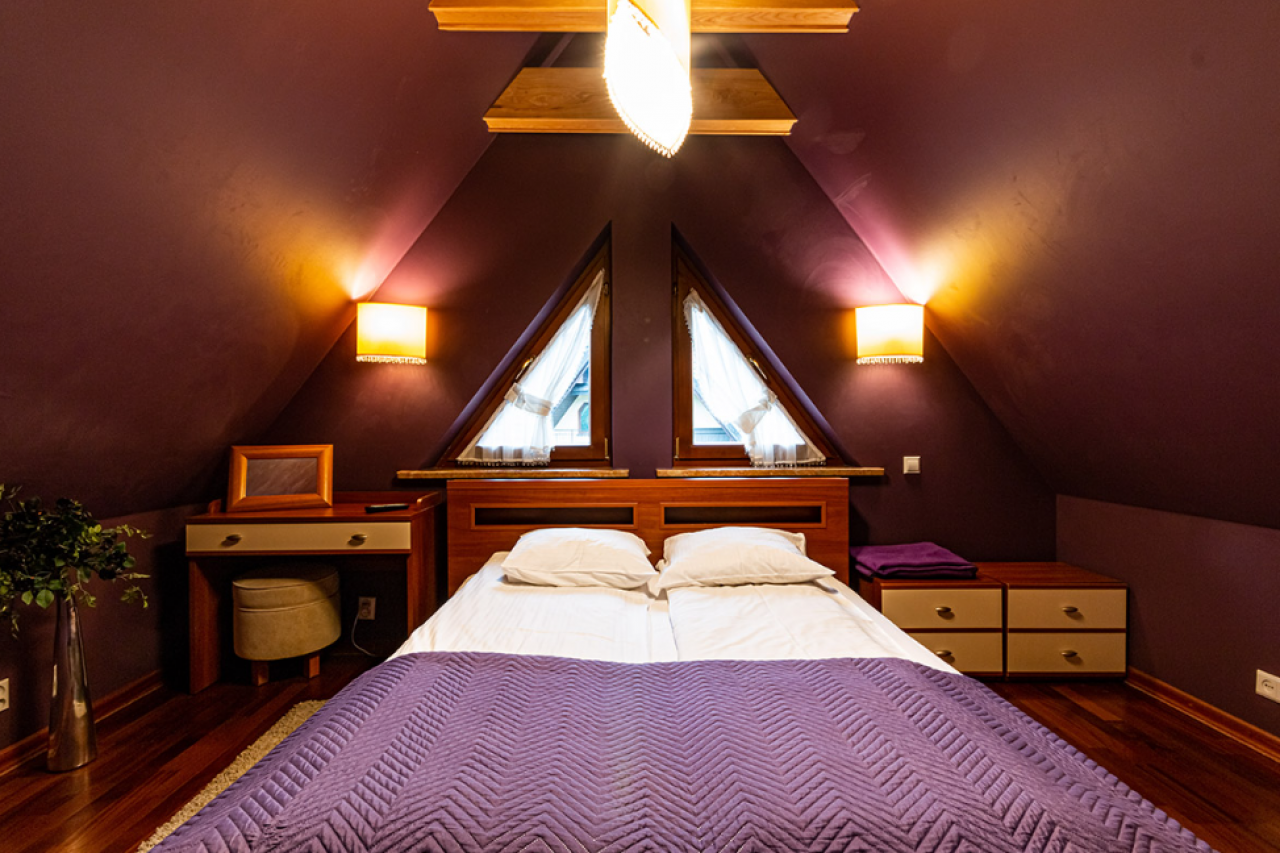 Konfiguracja: 2 sypialnie, salon z aneksem kuchennym, 2 łóżka małżeńskie, 1 rozkładana kanapa. Dwa poziomy, II piętro budynku.